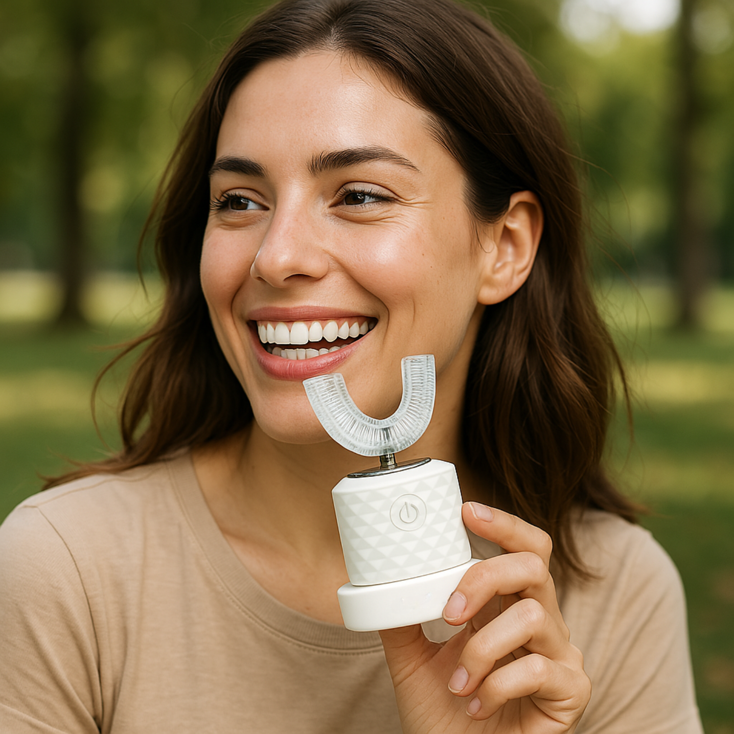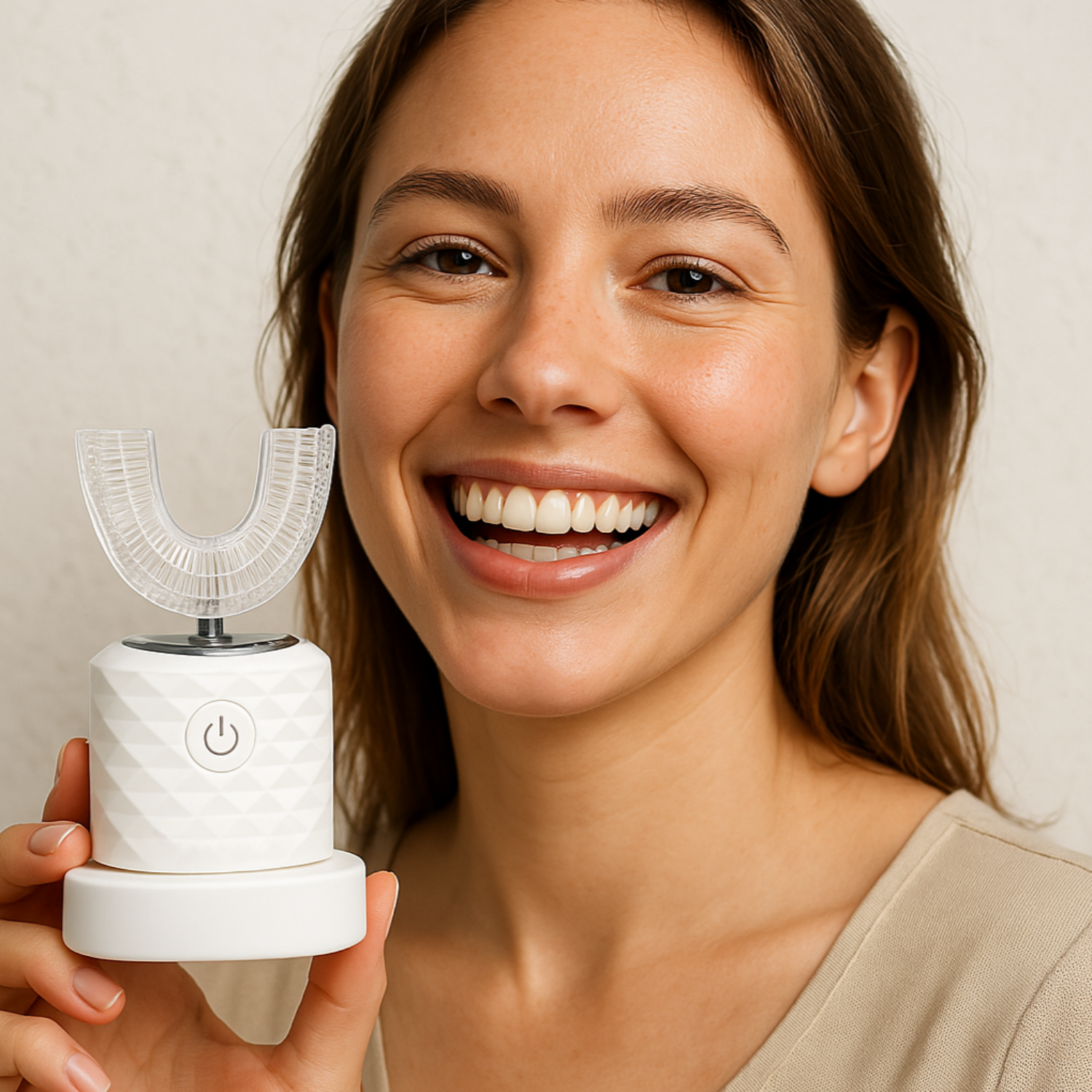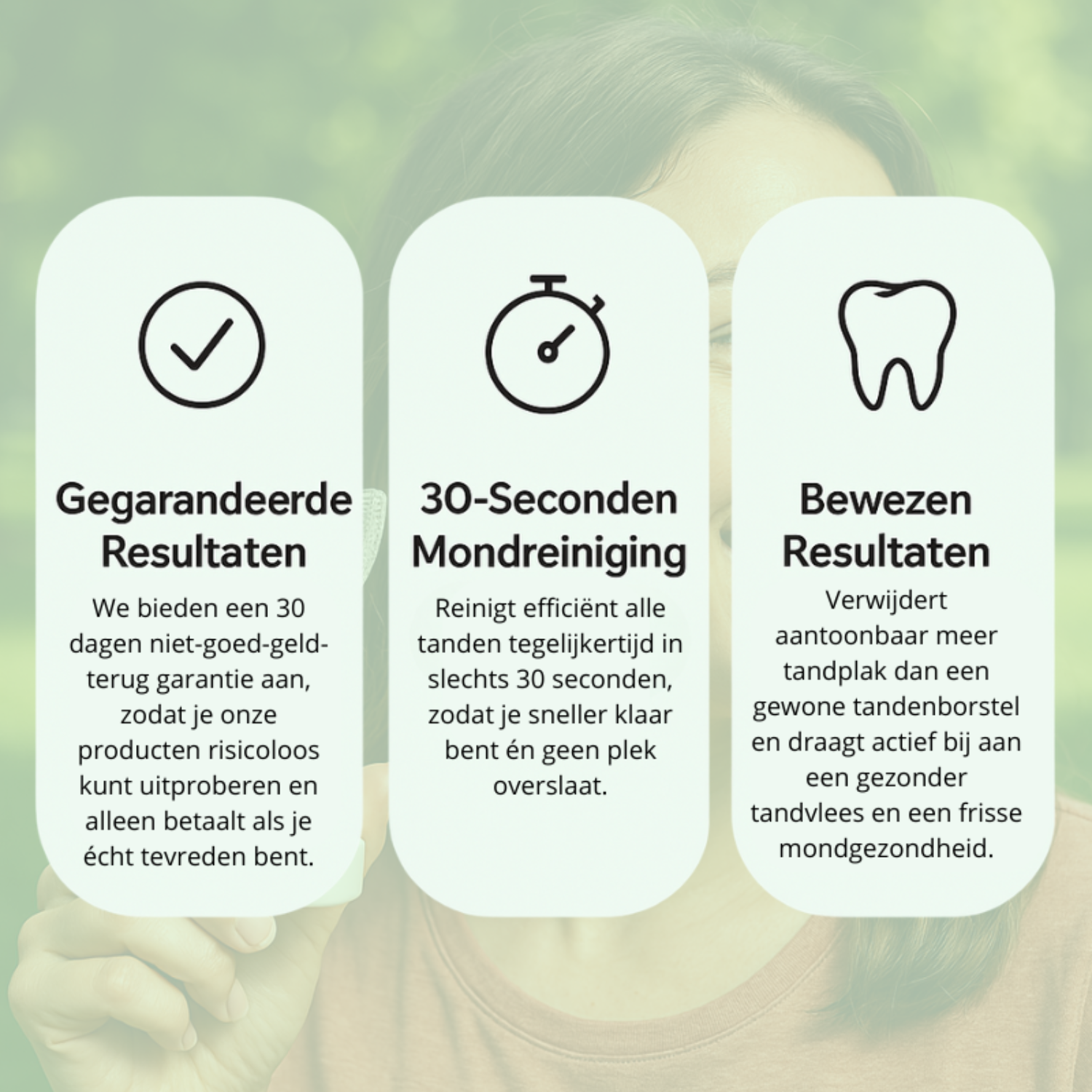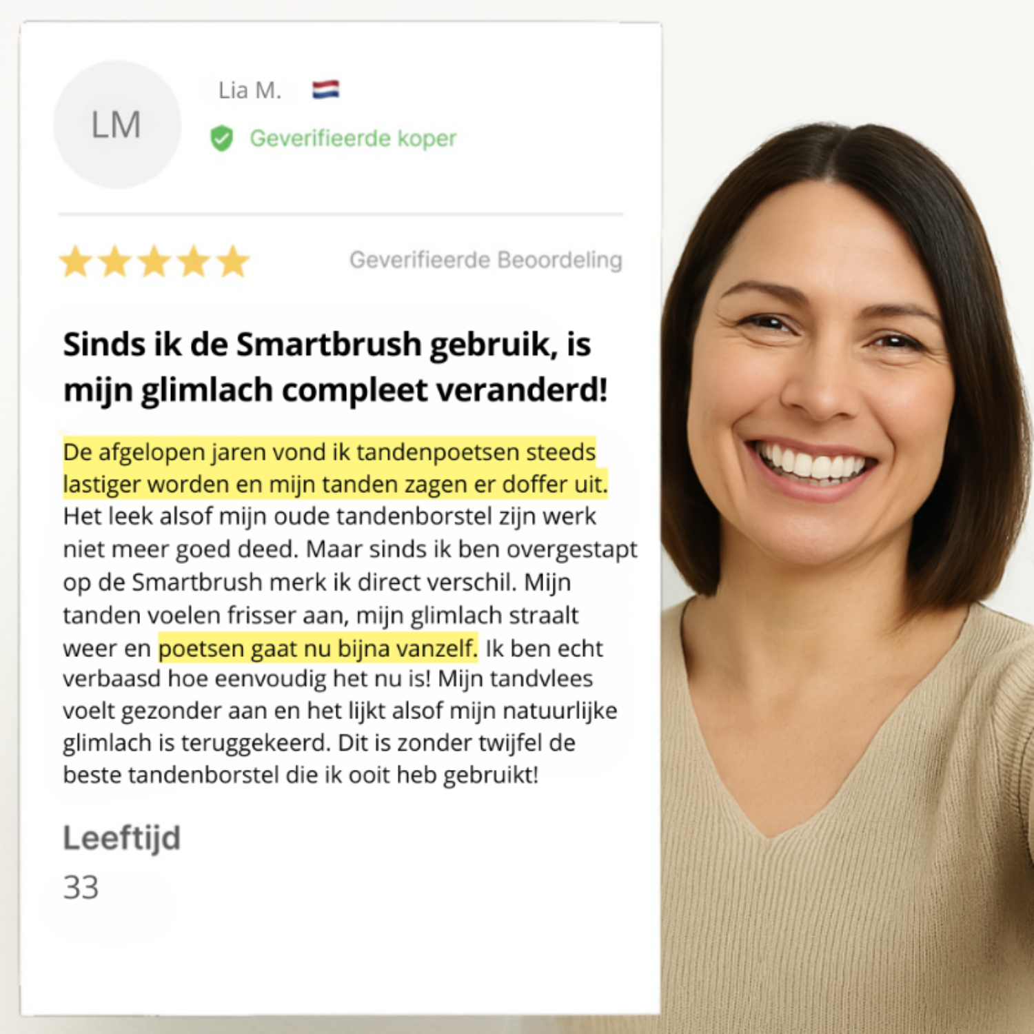"Ik gebruik nooit meer een traditionele tandenborstel! Deze is zo eenvoudig in gebruik, en mijn tanden zijn veel witter. Alles voelt frisser en schoner aan. De kwaliteit is fantastisch en de levering snel. 100% een aanrader voor iedereen!" – Marije