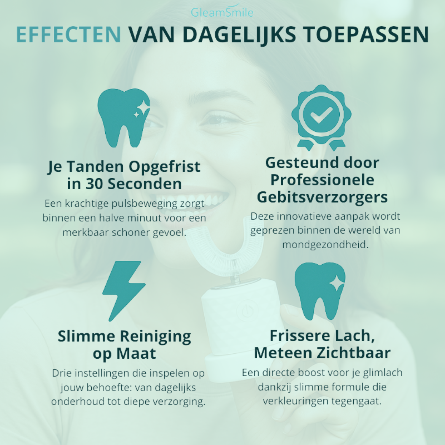 Ja, de GleamBrush is ontworpen om alle tanden tegelijkertijd van alle kanten te reinigen – voor, achter, boven en onder. Hierdoor is een halve minuut voldoende voor een volledige en grondige poetsroutine, in plaats van de gebruikelijke twee minuten.